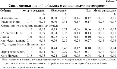 Для событий, благоприятных для репутации советского режима и преподносившихся одинаково в школах и в средствах массовой информации, мы выдвигаем гипотезу о низкой корреляции между знанием и годами обучения. Большинство людей получало информацию о таких событиях в раннем возрасте, и поэтому последующие годы получения информации в школе или из СМИ не много добавляли к первоначально полученным знаниям. Но информация о событиях, неблагоприятных для советского режима, обсуждение которых в контролируемых государством СМИ и школах было невозможно, оказывалась наиболее доступной для людей с более высоким уровнем образования. В Советском Союзе (в гораздо большей мере, чем в Соединенных Штатах) доступ к альтернативным источникам идей был привилегией, часто «прилагавшейся» к высшему образованию и соответствующим профессиям. Кроме того, образованные люди учились читать между строк в официальных сообщениях и искать неофициальные (в частности, подпольные) источники информации. Поэтому знания по темам, неблагоприятным для правящего режима и запрещенным для публичного обсуждения, должны быть значительно сильнее связаны с продолжительностью обучения, чем знания по темам, которые открыто преподавались и обсуждались.