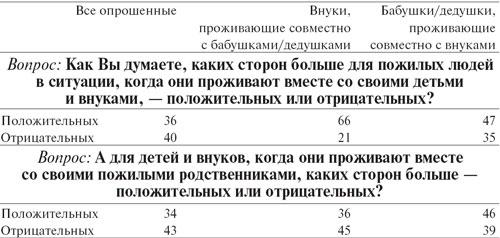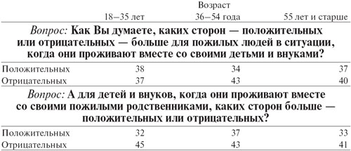 Основной аргумент в пользу совместного проживания — физическая, психологическая и экзистенциальная несамодостаточность стариков, их зависимость от более молодых членов семьи. Это следует из ответов опрошенных на открытый вопрос[2], в чем они усматривают положительные стороны совместного проживания для пожилых людей; респонденты ссылались на потребность стариков в уходе (12%), во внимании и общении, которое избавило бы их от чувства одиночества (11%), внесло бы в их жизнь радость и придало бы ей смысл (5%).