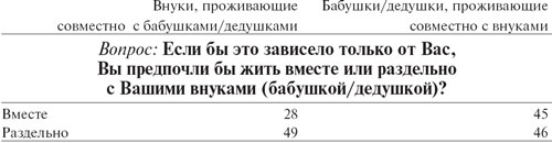 Предположение, что совместное проживание более выгодно для стариков, подтверждается и другими данными. Будучи прямо об этом спрошенными, 33% бабушек и дедушек высказали желание жить под одной крышей с внуками, тогда как среди внуков такое желание отмечено только у 18% респондентов (раздельно предпочли бы жить 57% бабушек/дедушек и 65% внуков). Кроме того, бабушки и дедушки, живя совместно с внуками, чаще последних высказываются за сохранение такого положения дел.