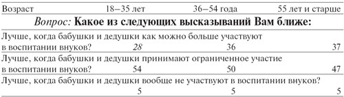 Участники опроса указывали и на то, что воспитание детей — это в первую очередь родительская забота (и, дескать, не следует переваливать ее на чужие плечи: «а родители на что? Это их обязанность»; «пусть родители сами поднимают детей» — 16%), что у стариков должна быть собственная жизнь («надо еще и для себя найти свободное время, не только для внуков» — 1%).