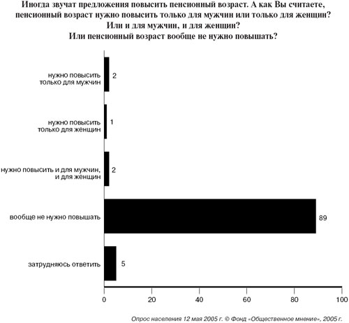 Часто говорят, что пенсионный возраст нельзя повышать из-за отрицательного отношения населения к этой идее, но этот аргумент не выдерживает критики, поскольку непопулярных реформ за последние пятнадцать лет было проведено немало. К тому же мнения россиян в данном случае не слишком отличаются от мнений граждан других стран, где возраст выхода на пенсию все-таки был поднят. Трудно ожидать, что люди добровольно согласятся на ограничение своих прав, особенно права на отдых. К тому же вопрос о пенсионном возрасте, как правило, задается отдельно — никто не спрашивает об отношении к альтернативным вариантам решения проблемы сбалансированности государственной пенсионной системы: повышению налогов или сокращению размера пенсии.