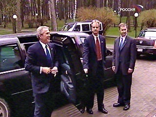 Владимир и Людмила Путины встретили американского президента и его супругу у входа в резиденцию. После рукопожатия и приветствий лидеры двух стран с супругами прошли в рабочий кабинет Путина. Вместе с президентом США в Ново-Огарево прибыла госсекретарь Кондолиза Райс.