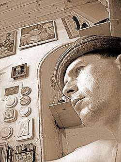 Автором оказался псковский художник-дизайнер Влад Выговский, который охотно поделился не только замыслом выставки, но и любезно пригласил в свою мастерскую в доме Сафьянчикова, где выяснилось, что Влад занимается весьма разнообразной деятельностью. По стенам мастерской были развешаны плакетки с изображением Пскова, рамки причудливых форм, в которых красовались сделанные Владом фотографии. На полках стояли всевозможные вазы и другие сосуды из керамики. Практически все здесь было сделано руками Влада, за исключением разве что стульев.