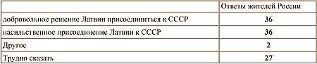 В апреле 2005 года похожий вопрос был задан и жителям России. Согласно итогам опроса, российские жители одинаково часто признавали это насильственным присоединением Латвии к СССР (36%) и добровольным вступлением в состав Союза (36%).