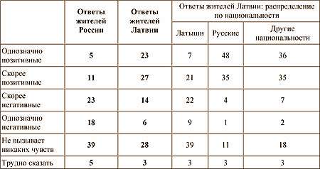 В целом жители Латвии чаще указывали, что упоминание России вызывает у них положительные чувства (50%). На негативные эмоции указали 20%, однако данные говорят о том, что ответы в разных этнических группах различны: на позитивные эмоции указали 28% латышей, 83% русских и 71% жителей других национальностей. Среди россиян упоминание Латвии вызывает более прохладные чувства: позитивные — у 16% опрошенных, негативные — у 41%. Следует отметить, что 39% опрошенных россиян указали, что упоминание Латвии не вызывает у них никаких ощущений (в Латвии о России так высказались 28%).