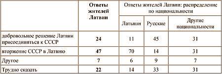 Исследование коснулось и оценки событий 1940 года в Латвии. В декабре 2004 года по заказу Института социальных и политических исследований Латвийского университета Центр изучения общественного мнения SKDS попросил жителей Латвии указать, было ли, по их мнению, вхождение Латвии в состав СССР добровольным решением Латвии присоединиться к союзу или стало следствием вторжения СССР. То, что эти события можно назвать скорее вторжением в Латвию, признали 47% опрошенных жителей Латвии, а добровольным присоединением это назвали 24% респондентов. Следует заметить, что добровольным вступлением Латвии в СССР это назвали 11% опрошенных латышей, 45% русских и 31% представителей других национальностей.
