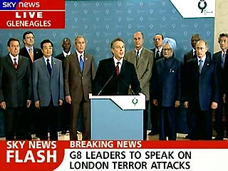 В момент, когда Тони Блэр зачитывал заявление, за его спиной выстроились президенты и премьеры семи ведущих стран, а также лидеры Бразилии, Индии, Китая, Мексики, ЮАР, руководители ООН, Международного валютного фонда, Всемирного банка и ВТО.