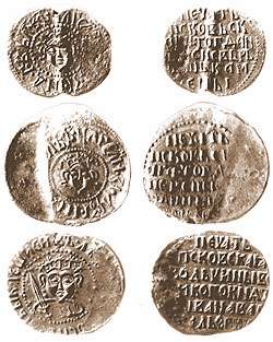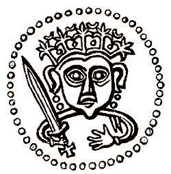 Дело в том, что изображение «лютого зверя» на монетах Пскова последней трети XV – начала XVI вв. занимало только одну из сторон монеты, в то время как на другой стороне размещалось изображение мужской головы в короне (рис. 5). В письменных документах XVII в. это изображение именовалось «глава человечья». Таким образом, полновесность и покупательную способность псковской монеты в последней трети XV в. гарантировали не одно, а два изображения. Какое же из этих изображений являлось гербом Псковской республики? Монету в Пскове, как известно, начали чеканить не на рубеже 60-х и 70-х годов XV в., а на четыре с лишним десятилетия раньше – в 1424 году. И на протяжении более четырех десятилетий единственным изобразительным символом на псковских монетах была именно «глава человечья». В настоящее время большинство историков согласны в том, что это изображение символизировало князя Довмонта-Тимофея – святого покровителя Пскова.