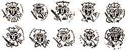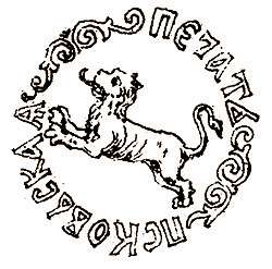 Итак, в 1424-1468 гг. покупательную способность псковской монеты гарантировало изображение «главы человечьей». Такое же изображение было помещено на псковских печатях XV в. Очевидно, что изображение «главы человечьей» являлось юридическим символом боярского правительства Пскова в годы расцвета Псковской республики. Таким образом, в XV в. в Пскове было два изобразительных символа, имевших юридическое значение – «глава человечья» и «лютый зверь». Оба эти изображения присутствуют на монетах и печатях Пскова, так что, мы вправе расценивать каждое из них в качестве государственного герба. Однако судьбы у этих гербов были разными. Из двух гербов более древним является «глава человечья». Она впервые появляется в 1415 году на печати, принадлежавшей псковским посадникам. В 1424 году, в особую ветвь власти Псковской республики выделяется судопроизводство, и на печати этого органа власти размещается тот же изобразительный символ (рис. 6). В том же 1424 году в Пскове начинается чеканка монет, и изображение «главы человечьей» помещается на монетах.