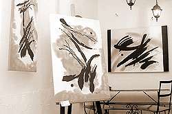 Небольшая изящная экспозиция, открывшаяся на прошлой неделе в галерее «Герцена, 6» -казалось бы, полная противоположность этому пафосу. Судите сами: основная часть выставки – это… расписные шёлковые платки. Плюс несколько работ, выполненных в той же – роспись по ткани – технике, хоть и не столь «утилитарного предназначения» (это всё-таки «картины»), но также вроде бы вполне легкомысленны и воздушны – материал обязывает…