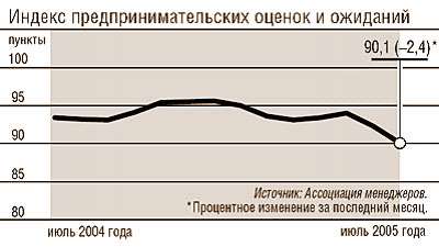 Интегральный индекс деловой активности снижается второй месяц подряд, в июле он упал еще на 0,3% – до 167,3 пункта. И это неудивительно. Важнейшими задачами 2005 года и в среднесрочной перспективе (до 2008 года) власти называют обеспечение высоких темпов роста российской экономики (свыше 6-7% в год), а также формирование фундамента для их сохранения в среднесрочной перспективе. Однако большинство прогнозов, разрабатываемых как официальными, так и независимыми источниками, довольно пессимистичны: даже в условиях сохранения цен на сырье и энергоносители на высоком уровне в 200-52006 годах ожидается снижение темпов роста ВВП до 5,8-5,9%. И итоги первого полугодия 2005 года подтверждают худшие опасения: темпы роста ВВП составили лишь 5,6%, а объемы промышленного производства практически не выросли. Посмотрим теперь подробнее, где именно сосредоточены основные проблемы российской экономики.