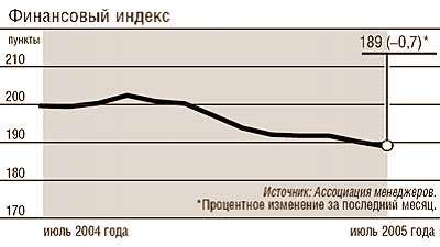 Финансовый индекс, который падает с ноября 2004 года, в июле снизился еще на 0,7%. Динамика индекса отражает ухудшение ситуации с ликвидностью: на рынке МБК однодневные ставки в последние месяцы выросли в разы к началу года и доходили до 8% годовых. Жесткая схема формирования стабилизационного фонда и продолжение политики бюджетного профицита привели к реальному денежному «сжатию» в российской экономике, которое восполнялось за счет активных внешних заимствований финансового и реального секторов.
