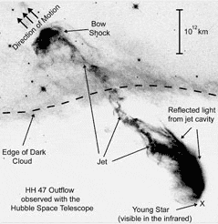 Новые звезды, как теперь уже хорошо известно, формируются из гигантских газопылевых облаков. Первоначально эта холодная материя, повинуясь гравитационным силам, образует протозвездный шар, окруженный обширным вращающимся диском. Потом постепенно из этого шара и диска "вылепляются", соответственно, звезда и окружающие ее планеты. Однако в ходе не до конца еще понятых процессов большая часть материала протопланетного диска поглощается звездой, падая на нее по спирали, а избыток энергии, получаемой в результате этих катаклизмов, уходит на производство звездных плазменных струй, вырывающихся из звезды под углами, перпендикулярными к вращающемуся аккреционному диску. Материал, выброшенный из звезды в виде этих струй, действует как своеобразный тормоз, замедляя вращение диска и позволяя большему количеству материала попасть на растущую звезду. Ученые теперь знают, что звездные струи играют существенную роль в формировании звезд, однако многие специфические особенности этих процессов остаются невыясненными.