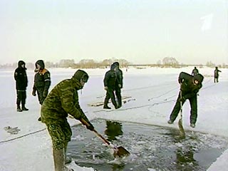 На берегу выставлено оцепление, место происшествия огорожено, работает техника и спасатели, прорубающие бензопилами широкую полынью для водолазов, сообщает ИТАР-ТАСС.