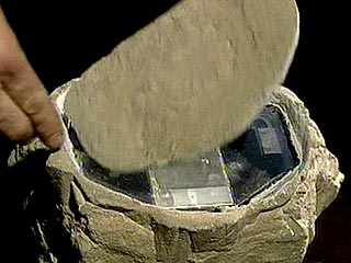 Игнатченко продемонстрировал устройство, представляющее собой искусственный "камень" внушительных размеров с вмонтированным в него электронным блоком. "Этот "камень" - его можно бросить практически с 9-го этажа, он может находиться в воде долгий период времени, он имеет несколько степеней защиты", - прокомментировал демонстрацию предмета начальник ЦОС ФСБ.