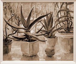 Наконец, «Зимний натюрморт» - на мой взгляд, лучшая из представленных работ. Ощущение холода и дискомфорта создаётся угловатыми линиями растений – голых и колючих алоэ, молочая и гибикуса, стоящих на подоконнике. Им вторит линия наледи на оконном стекле, чрезвычайно реалистично переданная живописно (и это маслом!). За окном с ними рифмуются голые, колючие и заледенелые зимние деревья. Серовато-зелёному, холодному общему тону и изломанным линиям по контрасту противостоят тёплые краски и форма сочного плода, находящегося в смысловом и композиционном центре картины. Немного охры в изображении дома за окном (геометрический центр работы) уравновешивает всю композицию.