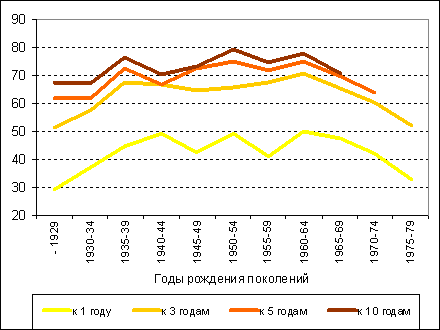 Неформальные отношения в начале совместной жизни для большинства носят временный характер пробного брака. Спустя какое-то время для многих пар отношения становятся вполне респектабельным, юридически оформленным браком. В то же время, данные RusGGS показывают, что регистрация брака все чаще не просто откладывается на время до проверки прочности отношений, но и не наступает вовсе (рис. 11). Если в поколениях 1950-х годов рождения уже к первому году от начала неформального союза 50% женщин зарегистрировали брак со своим партнером, то в поколениях второй половины 1970-х годов — всего 30%. Снижается показатель и для тех, кто долго живет вместе. К третьему году еще недавно регистрировали брак до 70% партнеров, начавших совместную жизнь с неформальных отношений, сегодня — 50%. К пятому году семейной жизни снижение составило более 10 процентных пунктов. Заметим, что если оформление отношений не происходит к 3-5 годам совместной жизни, шансы того, что брак в этом партнерском союзе будет когда-нибудь зарегистрирован вообще, минимальны — нет практически никакой разницы в процентах зарегистрировавших брак к пятому и десятому годам от начала отношений.