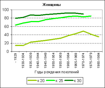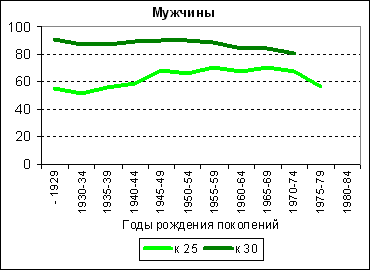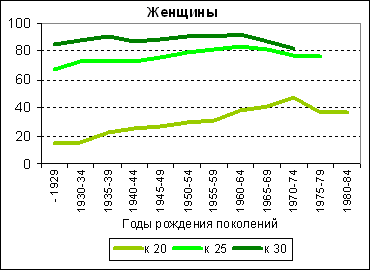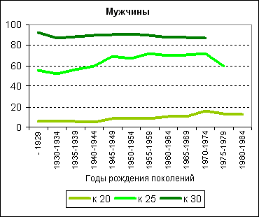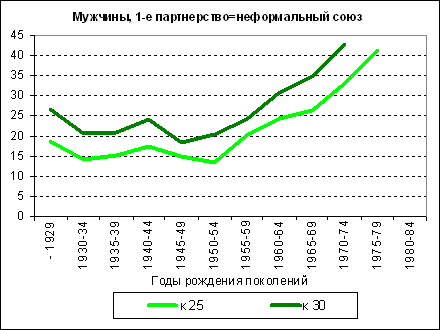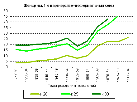 Рисунок 12. Накопленная доля мужчин и женщин, когда-либо зарегистрировавших брак с первым партнером к возрасту 20, 25 и 30 лет: реальные поколения годов рождения, указанных на абсциссе Итак, по всем параметрам брак как формальный союз теряет свою популярность. Он не только откладывается на более поздний возраст у современных поколений, но и вытесняется устойчивыми сожительствами.