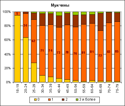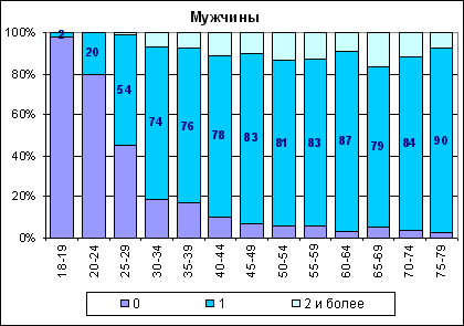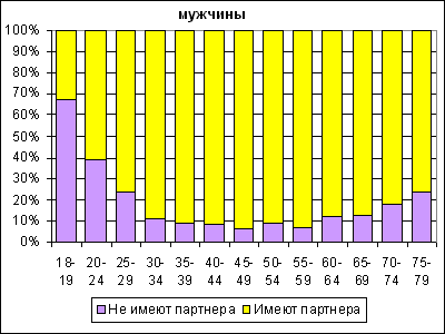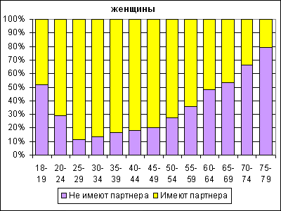 Распределение мужчин и женщин в каждой возрастной группе по наличию партнера представлено в табл. 1 и 2 и на рис. 1. Устойчивые партнерские отношения складываются с возрастом, и, не удивительно, что у женщин раньше, чем у мужчин: к 20 годам имеют партнера 32% мужчин и 48% женщин, к 25 годам, соответственно, 61% и 71%, к 30 годам — 76% и 88%. Однако в средних и старших возрастах тенденции для мужчин и женщин расходятся — доля женщин, имеющих партнера, сначала медленно, а затем ускоренно снижается, в то время как для мужчин характерно продолжение увеличения доли состоящих в партнерстве вплоть до 50 лет, когда она достигает 94%. Затем эти высокие показатели поддерживается примерно на одном и том же уровне, и только в возрастах старше 60 лет медленно возрастает доля мужчин, не имеющих партнера. Среди мужчин гораздо реже можно встретить одиноких, чем среди женщин. Так, среди 35-50-летних одинокий мужчина — достаточно редкий феномен, таковых менее 10%. Среди женщин эта пропорция, как минимум, в два раза выше. К 50 годам каждая четвертая женщина не имеет спутника жизни, а к 60 годам доля одиноких женщин достигает 50%.