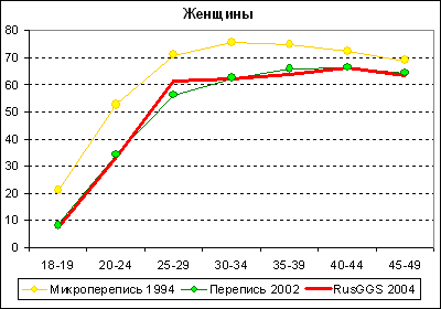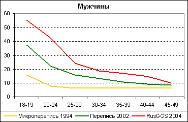 Рисунок 9. Доля состоящих в формальных союзах (брак зарегистрирован) среди мужчин женщин: микроперепись 1994 года, перепись 2002 года и обследование RusGGS 2004 (совместно проживающие партнеры), в процентах от числа всех опрошенных в указанных возрастных группах наверх Регистрировать брак становится немодно