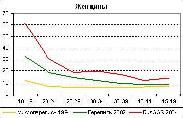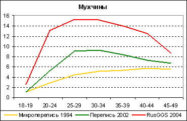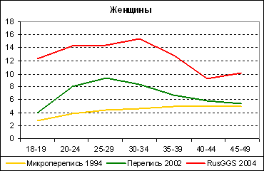 Рисунок 7. Распространенность неформальных союзов среди всех мужчин и женщин: микроперепись 1994 года, перепись 2002 года и обследование RusGGS 2004 (совместно проживающие партнеры), в процентах от числа опрошенных в указанных возрастных группах
