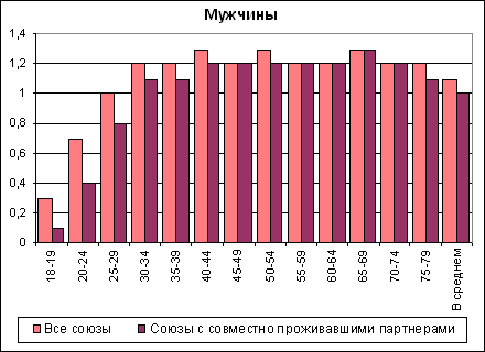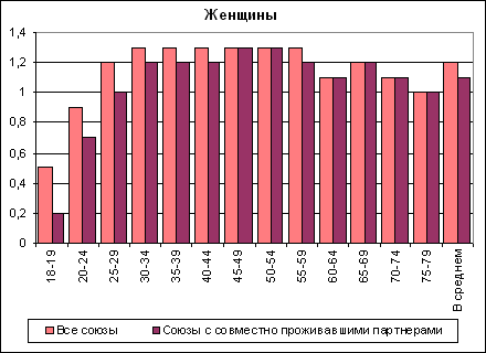 Рисунок 4. Среднее число всех партнерских союзов, включая текущий, и союзов с совместным проживанием партнеров наверх Одиночество по-мужски и по-женски: временно или навсегда?