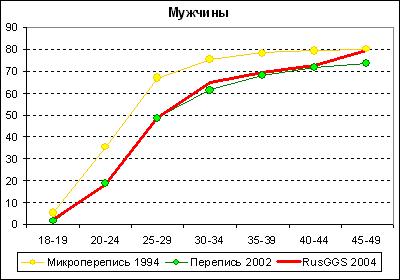 Рисунок 8. Распространенность неформальных союзов среди мужчин и женщин, состоящих в формальных и неформальных союзах (совместно проживающие партнеры) по данным микропереписи 1994 года, переписи 2002 года и обследования RusGGS 2004, в процентах от числа опрошенных в указанных возрастных группах Важно отметить, что данные выборочного обследования и переписи населения 2002 года не расходятся в оценке распространенности формальных союзов (т.е. тех, в котором партнеры брак свой зарегистрировали) в расчете на всех лиц данного пола и возраста (рис. 9). Последнее не только свидетельствует об отсутствии смещенности выборочной совокупности опрошенных в рамках обследования RusGGS относительно генеральной совокупности — населения России по всеобщей переписи, но и указывает, что, вероятнее всего, перепись населения недооценивает распространенность неформальных союзов, за счет того, что не все пары, даже проживающие совместно, готовы определить свой союз как брак, пусть даже с приставкой «незарегистрированный».