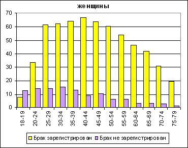 Итак, наше обследование позволяет выделить следующие основные состояния респондентов: а) не имеющие постоянного партнера на момент опроса, в том числе по причине того, что они никогда не имели постоянного партнера, расстались или развелись с предыдущим партнером, овдовели; б) имеющие постоянного партнера, в том числе проживающие совместно или раздельно с партнером. Кроме того, всем респондентам, имеющим партнеров (вне зависимости от того, проживает ли партнер в домохозяйстве респондента или нет), задавался вопрос о том, регистрировался ли когда-либо брак с данным партнером. Программа обследования также содержит вопросы, касающиеся истории всех партнерских союзов в жизни человека, о которых респондент желал рассказать с указанием дат начала, завершения каждого партнерства и причин его прекращения: расставание, смерть партнера. Если с тем или иным партнером регистрировался брак, то задавался вопрос о дате регистрации и дате развода, если таковой имел место.