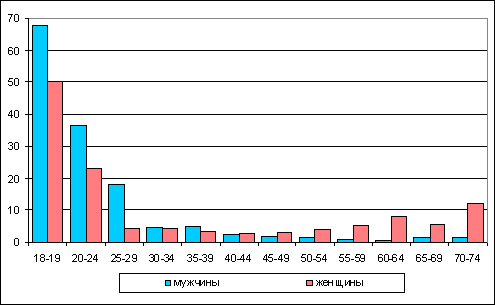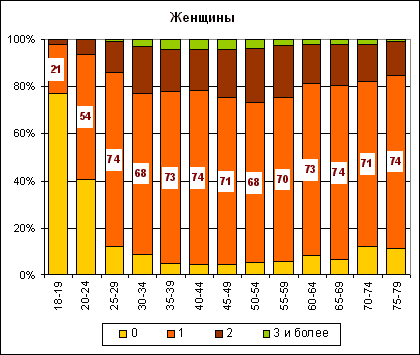Таблица 3. Доля мужчин и женщин никогда не имевших постоянного партнера (не состоявших в партнерских и брачных союзах) среди всех опрошенных и среди не имеющих партнера на момент опроса, в процентах| Возраст | Мужчины | Женщины | ||