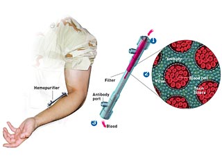 В гемоочиститель кровь попадает из артерии. Фильтр, изготовленный из биосовместимого пластика под названием полисульфон, покрыт специальными полученными из растений антителами, которые прочно прикрепляются к вирусам, не позволяя им возвращаться в кровоток.