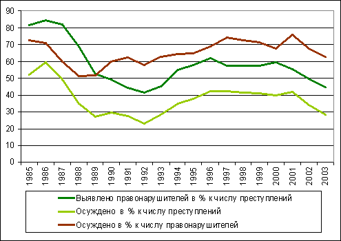 Расхождение «кривых» преступности и судимости, как их ни рассматривать, создает впечатление, что снижение социально-правового контроля преступности обусловлено неадекватной судебной деятельностью. Эта версия активно поддерживалась следственными органами и даже некоторыми средствами массовой информации. Судей обвиняли в завышенной требовательности к доказательствам вины, уклонении от рассмотрения сложных уголовных дел, необоснованном возвращении их на дополнительное расследование, мягкости выносимых приговоров, оправдании опасных преступников и т.д. Такие факты были. В эти годы у судей и работников правоохранительных органов под влиянием массированной, как справедливой, так и огульной, критики появилась боязнь ассоциироваться с прежней, «сталинской», практикой уголовного правосудия. Суды освобождались от партийной опеки, снимали с себя ответственность за борьбу с преступностью, приобретали некоторую независимость и даже демонстрировали ее.