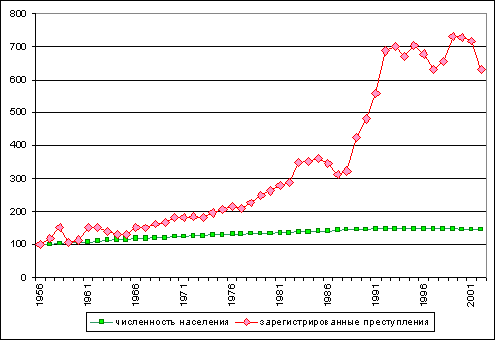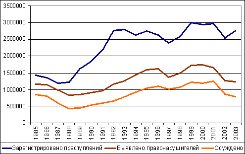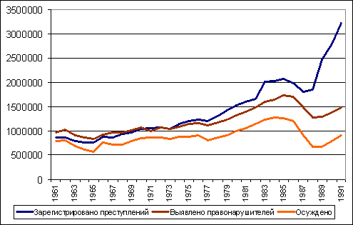 К концу существования СССР уровни преступности, числа выявленных правонарушителей и осужденных существенно разошлись. Если в 1961 году они соотносились как 100 (преступность) : 111,1 (выявленные правонарушители) : 91,1 (судимость), то в 1991 году как 100 : 46,1 : 28,5. Условно принимая процент выявленных правонарушителей и осужденных за некие индикаторы социально-правового контроля над преступностью, можно сказать, что он снизился более чем в 3 раза. И это произошло в стране с традиционно жестким контролем над поведением, деятельностью и даже мыслями людей. Народ получил определенную политическую и некоторую экономическую свободу, правда, мало чем обеспеченную; преступники получили чуть ли не абсолютную свободу для своей противоправной деятельности. Государство не в состоянии было цивилизованно защитить от преступных посягательств ни свою целостность, ни свою собственность, ни своих граждан. Именно в этот период серьезного ослабления государственности в условиях идеологического и нравственного безвременья и началась обвальная криминализация практически всех общественных отношений.