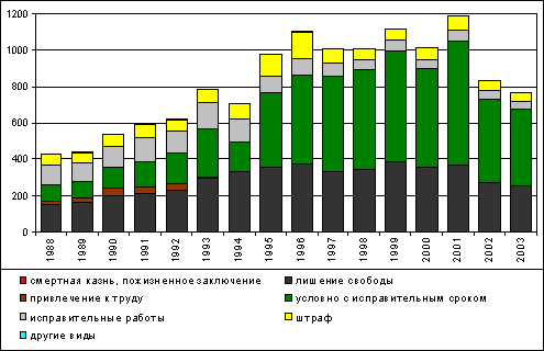 При анализе тенденций судимости нельзя обойти динамику различных видов уголовных наказаний. Она своеобразно коррелирует с динамикой преступности и судимости, реакцией правосудия на те или иные установки уголовной политики.