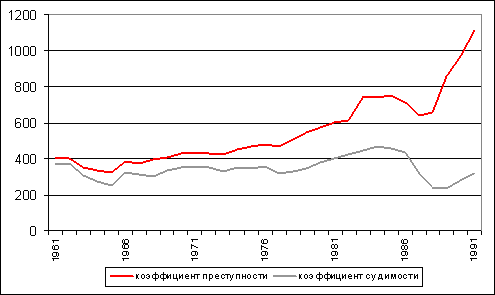 Рисунок 5. Коэффициенты преступности и судимости в 1961-1991 годах, на 100 тысяч человек В 1961 году в СССР регистрировалось 406 преступлений и 370 осужденных на 100 тысяч населения. После некоторого спада рассматриваемых показателей в короткий период эйфории «приближения» к коммунизму в 1965 году было зафиксировано 328 преступлений и 249 осужденных на 100 тысяч населения — самый низкий уровень. Некоторая демократизация правосудия в этот период сочеталась с идеологическим «искоренением» преступности. После смены курса коэффициент преступности стал устойчиво расти, а коэффициент судимости, за исключением некоторых лет, изменялся мало. Первый за 1961-1991 годы увеличился в 2,7 раза, второй снизился на 14%.