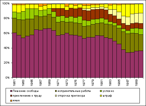Позитивная тенденция, которая проявилась в советское время, — это постепенное (хотя и неровное) снижение в структуре уголовных наказаний удельного веса лишения свободы. В 1961 году к лишению свободы приговаривалось 60,4% осужденных. Несколько лет его доля снижалось, но директивное усиление борьбы с преступностью в середине 60-х годов сказалось на росте доли этого строгого наказания: в 1969 году она составила 66,5%. Увеличение числа осужденных к лишению свободы потребовало существенного расширения мест в ИТК, ибо уже в 1967 году в них находилось 57200 человек сверх лимита мест для заключенных.
