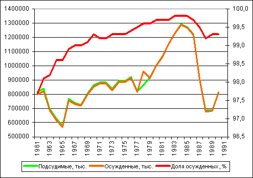 Число заключенных (с учетом их накопления) в течение всего периода с 1961 по 1991 год по своим абсолютным показателям примерно в 2 раза превышало число осужденных (по годам), а кривая динамики первого со сдвигом на год повторяла кривую динамики судимости. Аналогичный вывод можно сделать и при сопоставлении тенденций названных показателей в расчете на численность населения.
