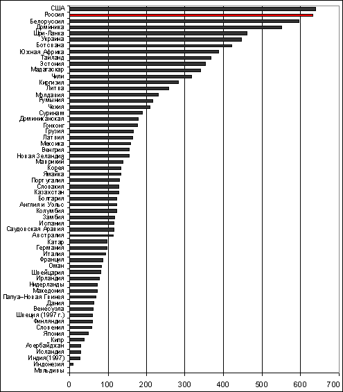 Рисунок 13. Число заключенных в некоторых странах мира в 2000 году, на 100 тысяч населения Источник: данные из Седьмого обзора ООН, ранжированные по уровню призонерсти. Амнистированы были даже террористы, которые сразу же взялись за свое кровавое ремесло. Примером могут служить некоторые участники бесланского теракта. А всего было освобождено от уголовной ответственности и наказания (включая его снижение) около 700 тысяч человек. Видимо, это не тот путь «вхождения в Европу». По первому варианту амнистии от 26 мая 2000 года (был частично поправлен 28 июня) из следственных изоляторов одной Москвы освобождению подлежали 311 убийц и насильников. Не случайно амнистия вызвала непонимание даже у специалистов [21]. Искусственное снижение численности тюремного населения при высоком уровне тяжкой и особо тяжкой преступности, низкой эффективности работы правоохранительных органов, неразвитой системе видов наказаний, альтернативных лишению свободы, колоссальных криминогенных проблемах в стране и порушенной системе предупреждения преступности не только недостижимо, но и особо криминогенно.