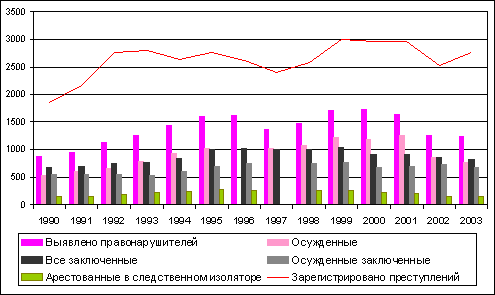 С принятием нового УК РФ тенденции в судимости сохранились. Ножницы между преступностью и судимостью, между тяжестью совершаемых преступлений и тяжестью применяемых за их совершение уголовных наказаний продолжали увеличиваться.