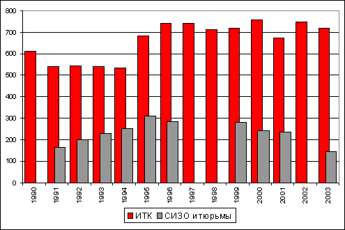 Число лиц, отбывающих лишение свободы в ИТК, в 1990-1995 годах увеличилось на 26,2% и то лишь в последние два года, хотя преступность и судимость, как известно, возросли, соответственно, на 50% и 71%. В эти годы шло переформирование и даже сокращение числа колоний союзного «наследства». 215 «лесных» ИТУ стали колониями различных режимов. В 1995 году в России насчитывалось 755 колоний. За эти годы сокращался и лимит мест в колониях. Но он практически впервые в истории оставался на 10-20% выше фактической численности осужденных заключенных. В 1995 году лимит свободных мест при увеличении числа ИТК составил 83 тысячи.