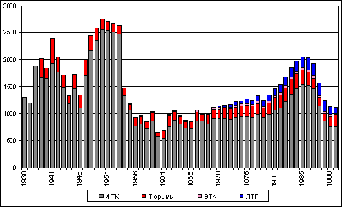 Рисунок 8. Число заключенных в СССР в 1936-1991 годах, тысяч человек Примечание. Число заключенных по состоянию на 1 января каждого года. Данные о числе заключенных не включают заключенных, находящихся в соответствующих учреждениях КГБ СССР. В 1970 году, кроме указанного числа заключенных, 27482 человека находились в ЛТП. Вместе с ними общее число заключенных в этом году составило 1146882 человека. В 1985 году были образованы ВТП (воспитательно-трудовые профилактории), куда в том же году было направлено 2539 человек. В 1986 году образованы ЛВП (лечебно-воспитательные профилактории) и спецкомендатуры для осужденных, направленных на принудительный труд. В ВТП, ЛВП и спецкомендатурах, соответственно, находились в 1986 году 55, 6103 и 309433 заключенных, в 1987 году — 203, 4630 и 307352, в 1988 году — 165, 852 и 254015, в 1989 году — 165, 365 и 141785, в 1990 году — 50, 184 и 124575, в 1991 году — 17, 41 и 129481 заключенный.
