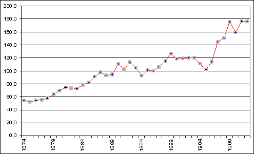 Е. Тарновский был прав, когда писал, что реальное число преступников в 14 раз выше указанного в сводках. С.С. Остроумов называет общую цифру уголовных дел перед Первой мировой войной — 2,5 млн. [5]. Это примерно 2800 уголовных дел на 100 тысяч населения. А в каждом уголовном деле могло быть по несколько обвиняемых и преступлений. Представленные на графике данные об осужденных могут как-то свидетельствовать лишь о тенденции роста судимости, а следовательно, и преступности. Если принять данные 1874 года за основу, то к 1912 году судимость увеличилась в 3 раза (321%). И это может быть близко к криминальным реалиям России перед Первой мировой войной и революцией 1917 года.