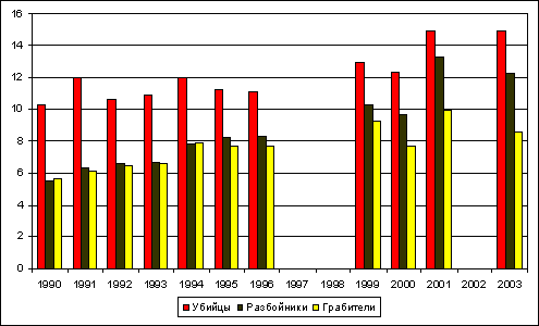 Рисунок 14. Доля заключенных за некоторые тяжкие преступления в ИТК в 1990-2003 годах, в % В местах лишения свободы находится до 60% неоднократно судимых, 45 тысяч из них признаны особо опасными рецидивистами, 15% — алкоголиков и наркоманов, около 70% страдают расстройствами психики, более трети заключенных не имеют в зоне определенных занятий [22]. Когда-то мы много говорили о подневольном труде советских заключенных. Сегодня приходится говорить об огромной безработице тех, кто хотел бы работать. Ничем не занятый заключенный — новая проблема для пенитенциарных заведений России.