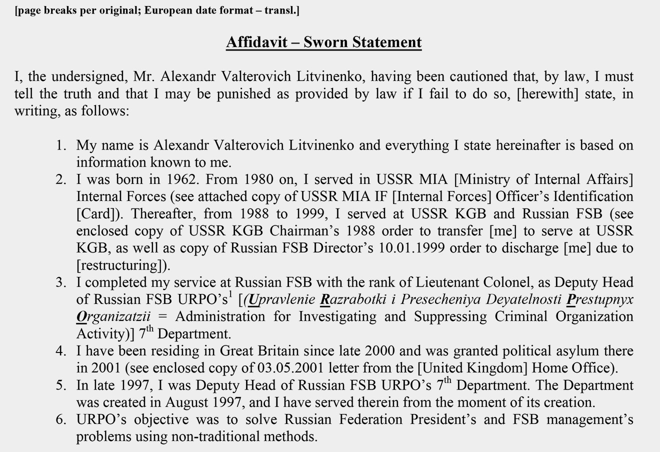 Открытая Россия публикует текст показаний Александра Литвиненко, которые он дал под присягой