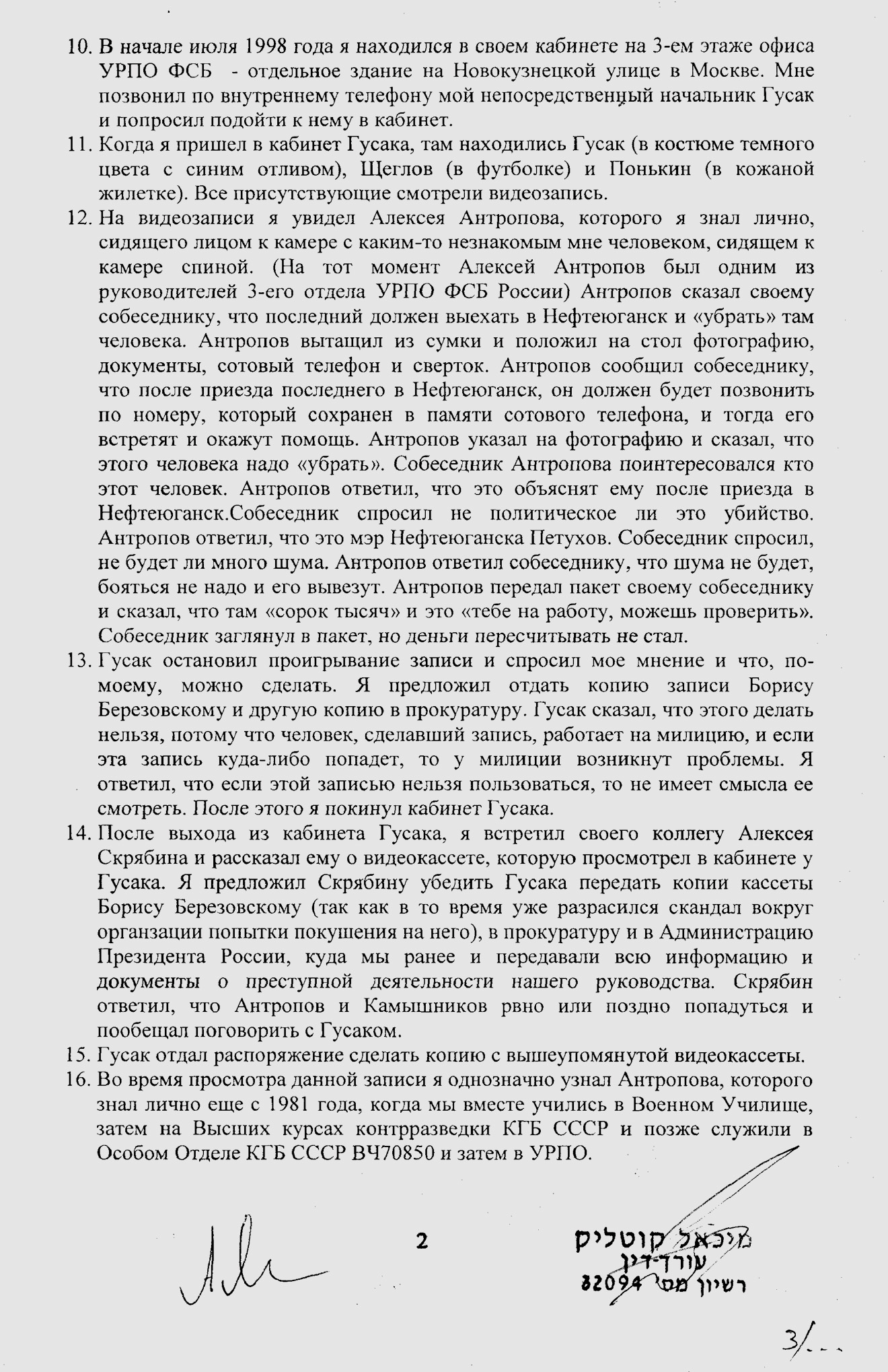 - После выхода из кабинета Гусака я встретил своего коллегу Алексея Скрябина и рассказал ему о видеокассете, которую просмотрел в кабинете у Гусака. Я предложил Скрябину убедить Гусака передать копии кассеты Борису Березовскому (так как в то время уже разразился скандал вокруг организации попытки покушения на него), в прокуратуру и в Администрацию Президента России, куда мы ранее и передавали всю информацию и документы о преступной деятельности нашего руководства. Скрябин ответил, что Антропов и Камышников рано или поздно попадутся, и пообещал поговорить с Гусаком.