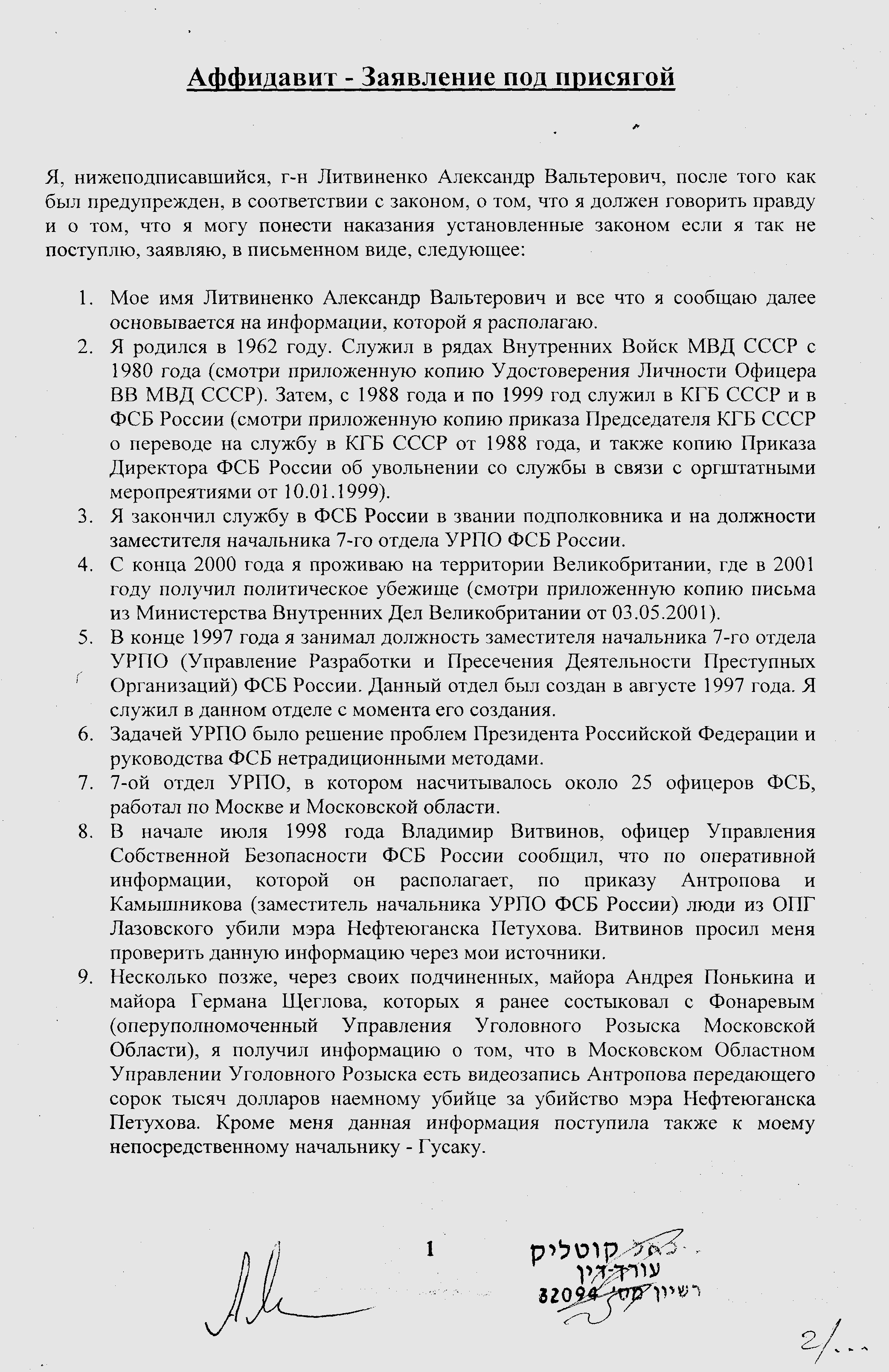 Я, нижеподписавшийся, г-н Литвиненко Александр Вальтерович, после того как был предупрежден в соответствии с законом о том, что я должен говорить правду, и о том, что я могу понести наказания, установленные законом, если я так не поступлю, заявляю в письменном виде следующее: