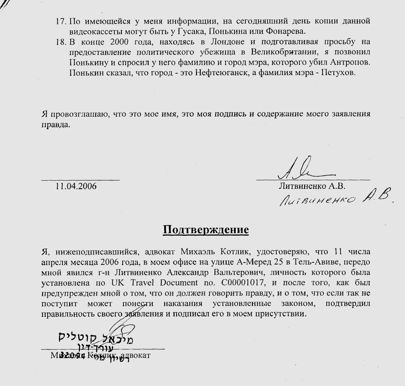 Я, нижеподписавшийся адвокат Михаэль Котлик, удостоверяю, что 11 числа апреля месяца 2006 года в моем офисе на улице А-Меред 25 в Тель-Авиве передо мной явился г-н Литвиненко Александр Вальтерович, личность которого была установлена по UK Travel Document no. C00001017, и после того, как был предупрежден мной о том, что он должен говорить правду, и о том, что если так не поступит, может понести наказания, установленные законом, подтвердил правильность своего заявления и подписал его в моем присутствии.