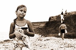 «Прощание с морем». Девочка с морским камушком в руках задумчиво смотрит мимо нас. Взрослые уже не слышат и не хотят слышать шум моря, они собрали свои шлёпанцы и полотенца и тронулись в путь – к грязному поезду, который увезёт их «домой» - туда, где дымят заводские трубы и шесть месяцев в году лежит снег.