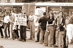 Прямо напротив заявителей митинга, через «ленинскую» клумбу, в одночасье ставшую некой «бархатной баррикадой», спиной к площади и лицом к НБП и ОГФ, расположились нестройные ряды двух небезызвестных молодежных организаций – Псковского отделения «Молодой гвардии «Единой России» и «Первого рубежа». В их руках были весьма скромные самодельные рисованные плакатики, далекие от вежливости: «Лимон не зря в тюрьме сидел. Молодым место нагрел!», «Цирк уехал, а вы почему остались?». Кампанию «митинга против митинга» возглавляла фронтвуменша юных псковских единороссов в чине начальника штаба (как-то все там по-военному) Наталья Соколова. По ее команде несколько десятков голосов, хихикая и стесняясь одновременно, кричали «через клумбу»: «Уголовники!», «Путину – да, фашизму – нет!». Им в ответ сначала звучало вполне традиционное для «непротивления злу насилием» правозащитное «Уважайте свою Конституцию!», а потом, когда дошло до «фашистов», - «путинюгенд!»