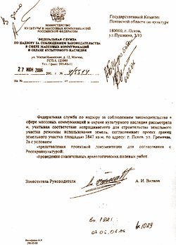 Между тем в научно-производственном центре (НПЦ) по охране памятников никак не отреагировали на новость о незаконных работах, начатых на памятниках Гремячей горы. Потом выяснилось, что НПЦ вместе с ТУМИО (территориальным управлением Министерства имущественных отношений РФ) по Псковской области еще в 2003 г. передали здания памятников (кроме церкви Козьмы и Дамиана) на баланс ООО «Гостиничный комплекс» [ 2 ], а весной 2004 г. согласовала проектирование на Гремячей горе гостиницы, выдав подробные технические условия.