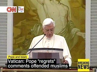 "Я глубоко сожалею о реакции в некоторых странах на некоторые фрагменты моего обращения, сделанного в университете Регенсбурга, которые были сочтены оскорбительными для чувств мусульман", - сказал Папа. "Это, на самом деле, цитата из средневекового текста, которая никоим образом не отражает моего личного мнения. Я надеюсь, это умиротворит сердца и прояснит истинное значение моего обращения, которое в целом было и есть приглашение к открытому и искреннему диалогу, с взаимным уважением", - сказал Бенедикт XVI. Он добавил, что уважает ислам.